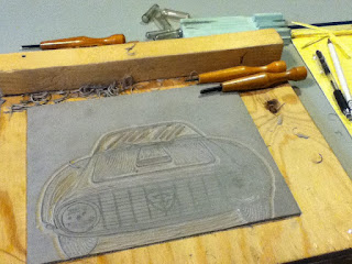 There are a couple different print projects hanging from the drying rack in various stages of completeness. The mountain print is coming along with one more wood block to print, which will add detail to the peak.